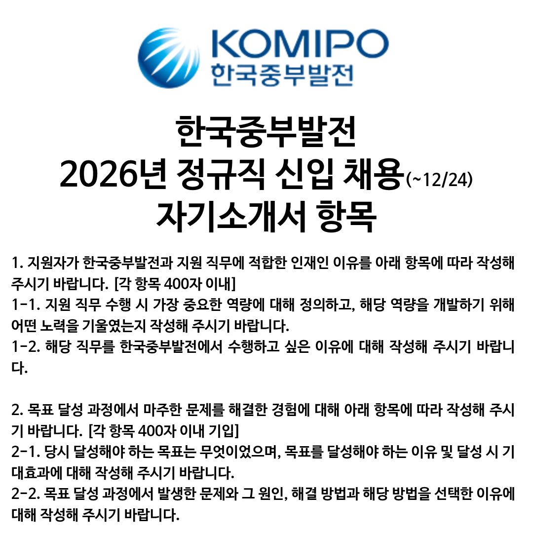한국중부발전 신입사원 채용의 자기소개서 항목 빠르게 가져와 봤습니다. 12월 24일, 크리스마스 이브가 지원접수 마감일이니 열심히 준비해서 잘 지원하신 다음, 따뜻하고 즐거운 크리스마스 맞이하시면 어떨까 싶습니다.