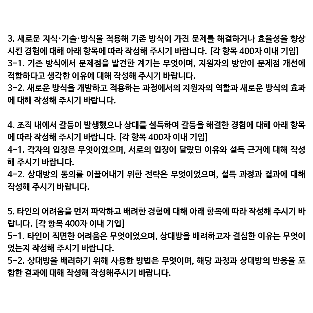 고객님의 간단한 스펙과 더불어서 각 문항에 들어갈 간략한 소재, 즉 ‘이런 경험이 있었다’ 정도로만 준비해 주시면, 그것을 문항 의도에 맞게 잘 정리해 드릴 수 있습니다. 또한 도저히 이것과 관련된 경험은 생각이 나지 않는다, 하시는 경우에도 고객님의 스펙과 정보들을 가지고 함께 상담을 통해 해결책을 고민해드릴 수 있으니 편하게 상담 받아보시기 바랍니다.