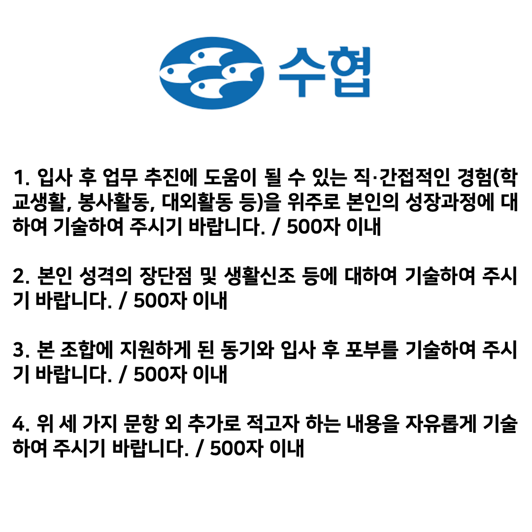 2026년 전국 수협 일괄공개채용 자기소개서 작성에서 간략한 가이드라인을 제시해드리고자 합니다.
